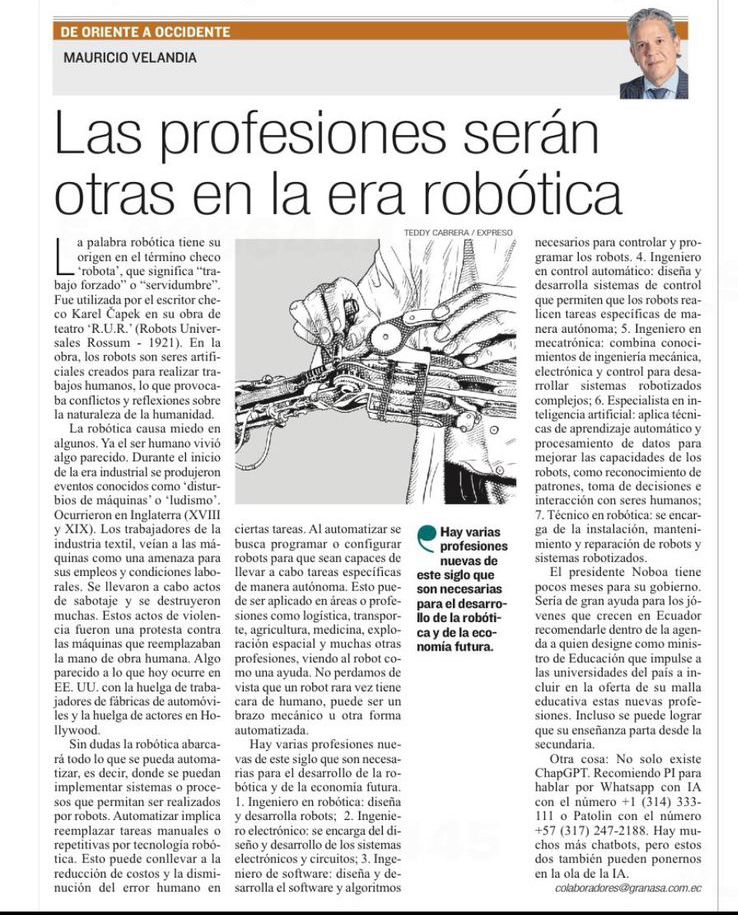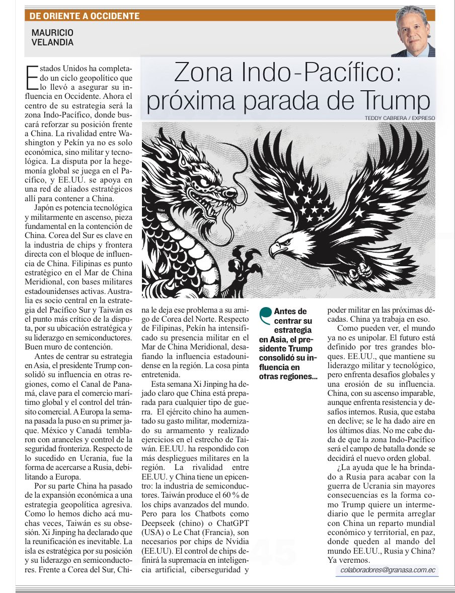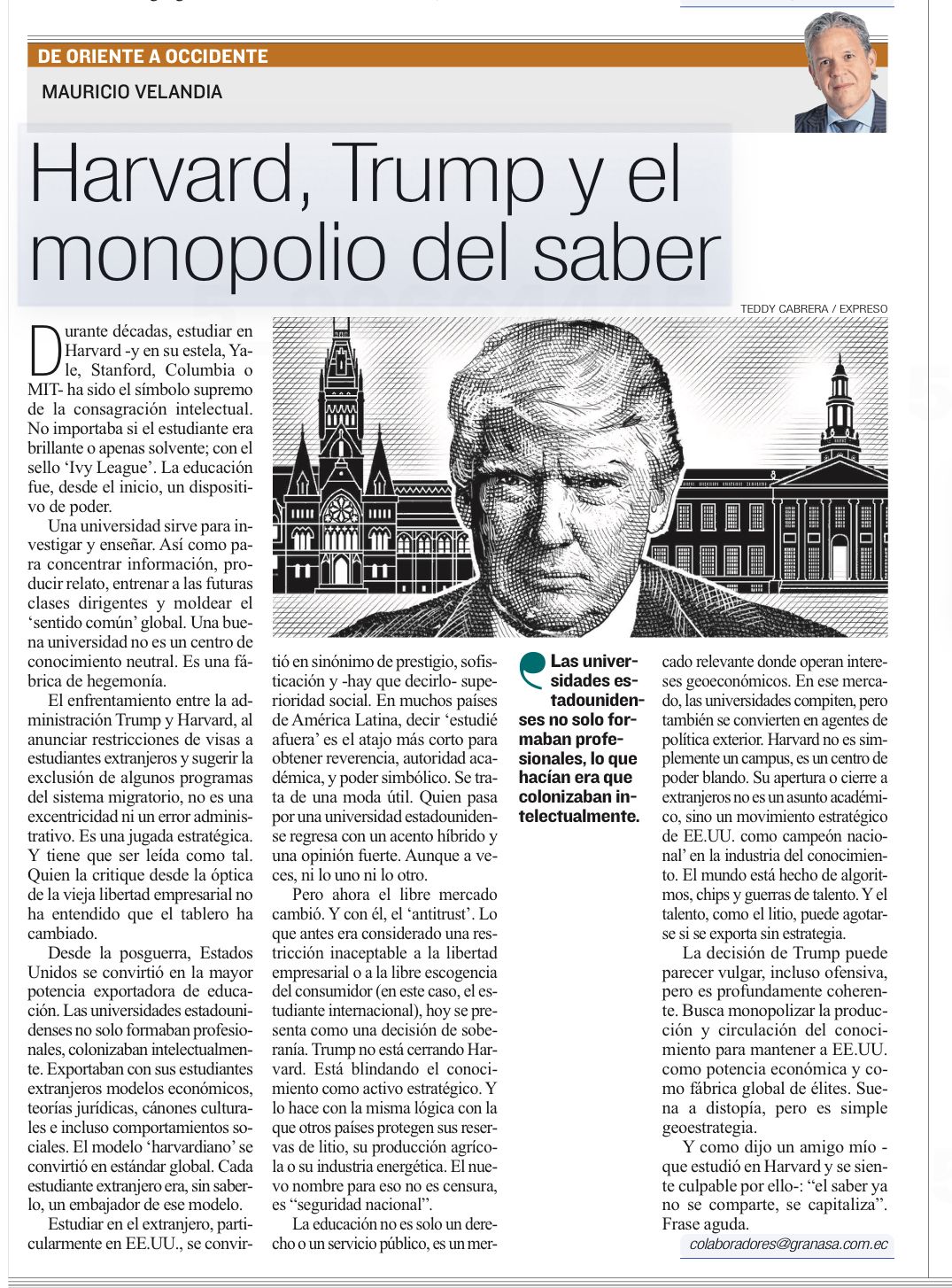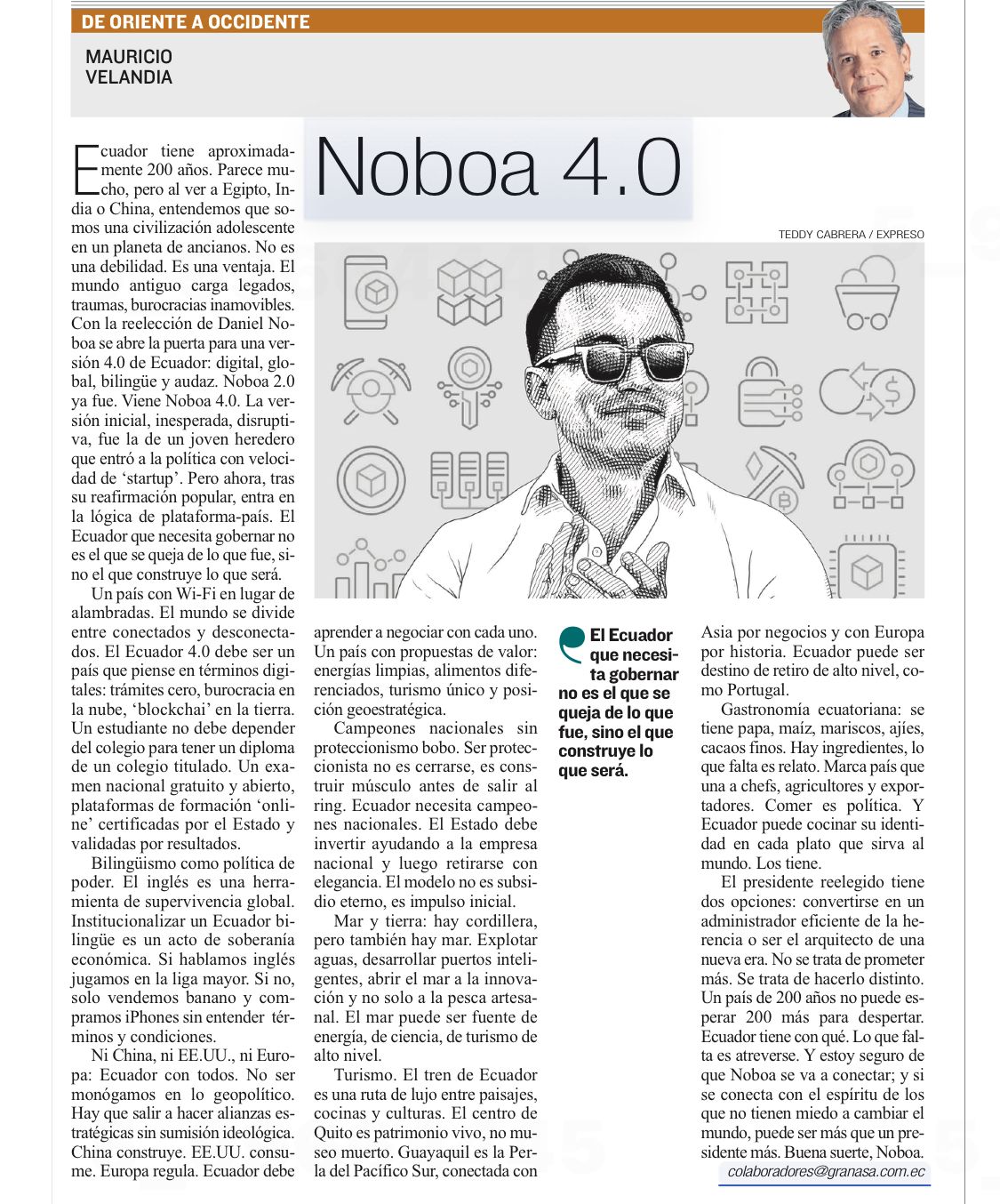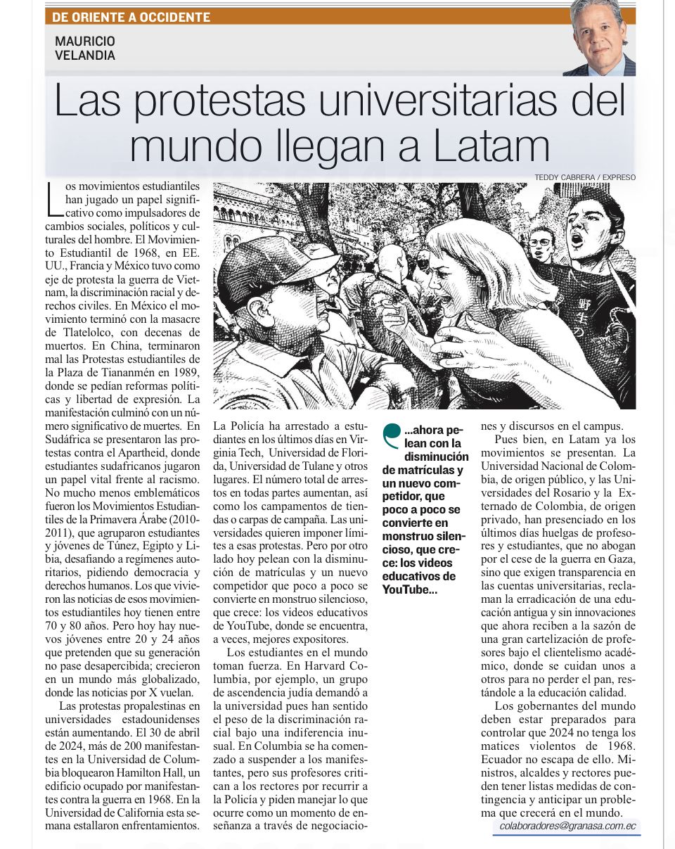 Mauricio Velandia es columnista quincenal, cada sábado, del periódico ecuatoriano El Expreso, de genero liberal, con una gran cantidad de suscriptores digitales y físicos, con alcance nacional e internacional. Acá aparecen las columnas publicadas por Mauricio Velandia en dicho periódico.
